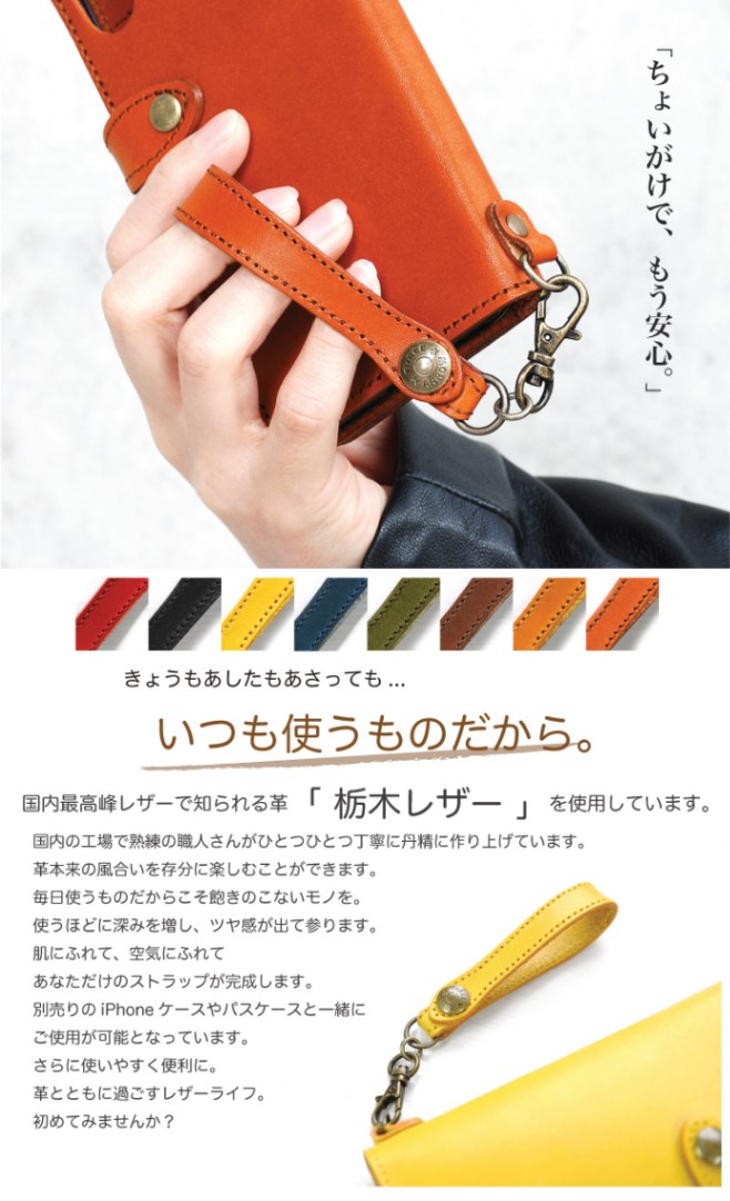 日本国内で熟練の職人さんが一つ一つ丹精こめて作り上げた、国内最高峰の栃木レザーを使用したハンドストラップです。