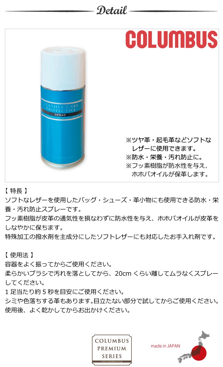 特殊加工の撥水剤を主成分にしたソフトレザーにも対応した防水・栄養スプレーです。