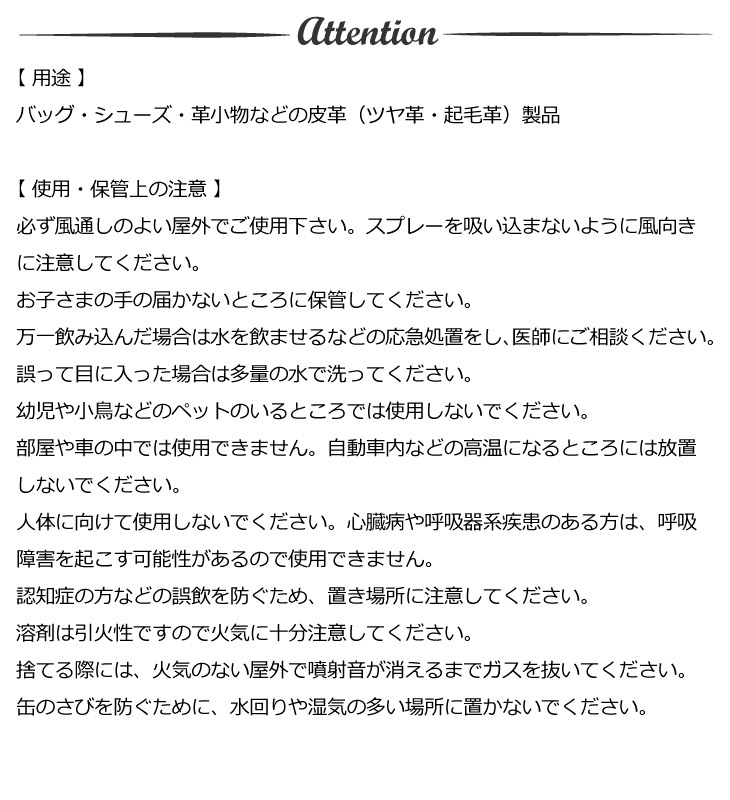 用途 : バッグ・シューズ・革小物などの皮革(ツヤ革・起毛革)製品の防水・保護