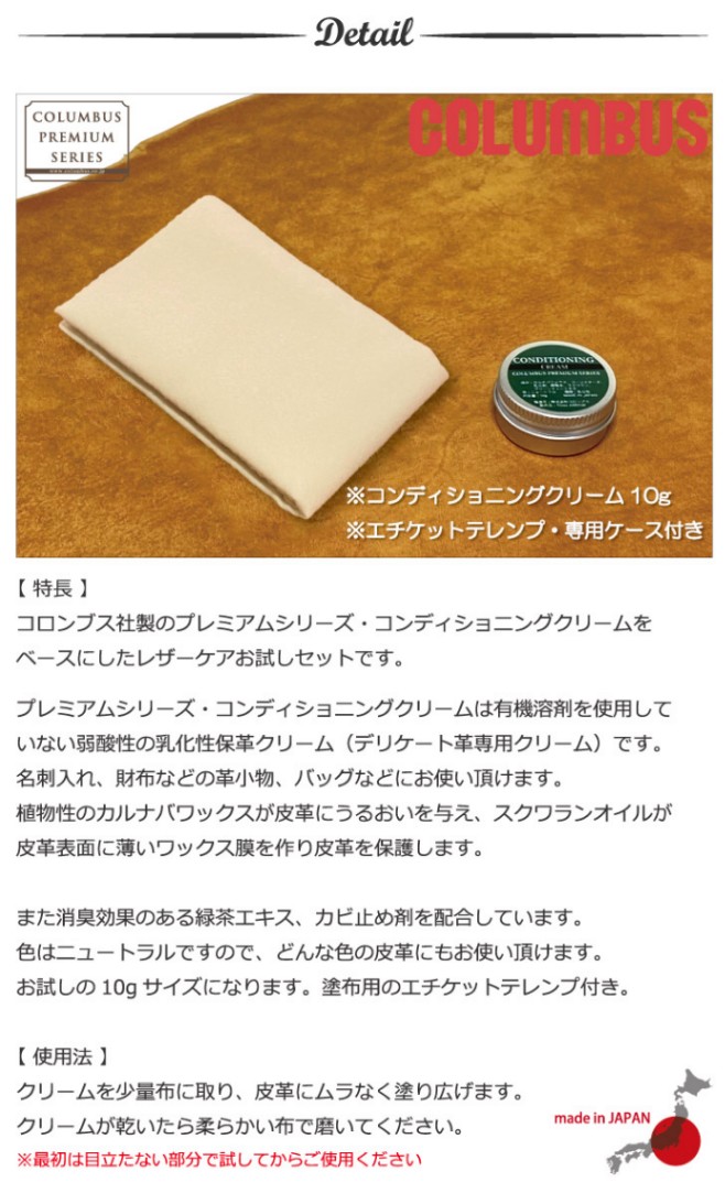 コロンブス社製のデリケート革専用コンディショニングクリーム(プレミアムシリーズ)をベースにしたお手入れセットになります。